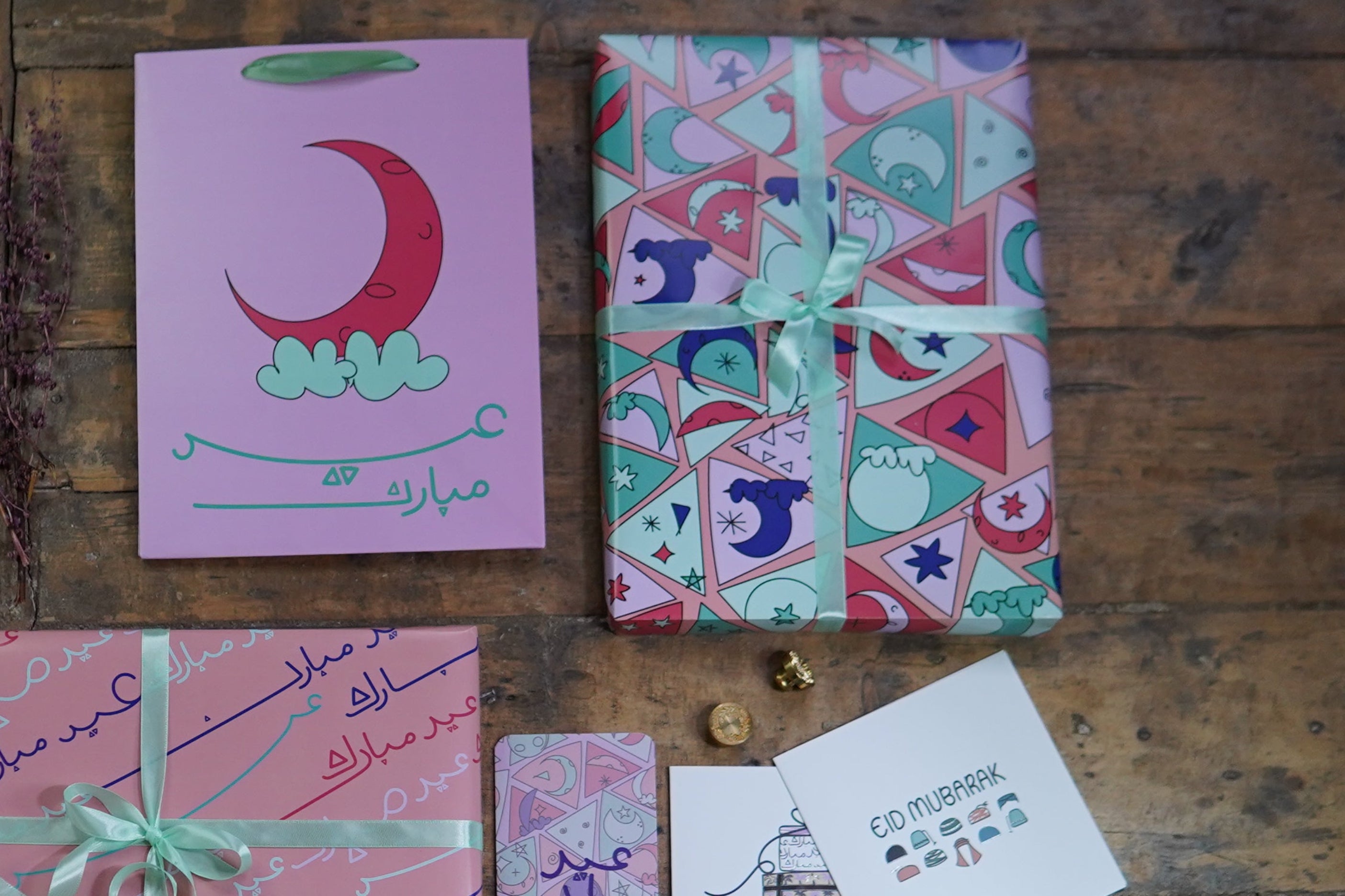 This children’s wrapping paper offers a playful twist on the Eid moon, capturing the sense of wonder and excitement around Eid. A charming design that brings a magical feel to children’s gift wrapping.