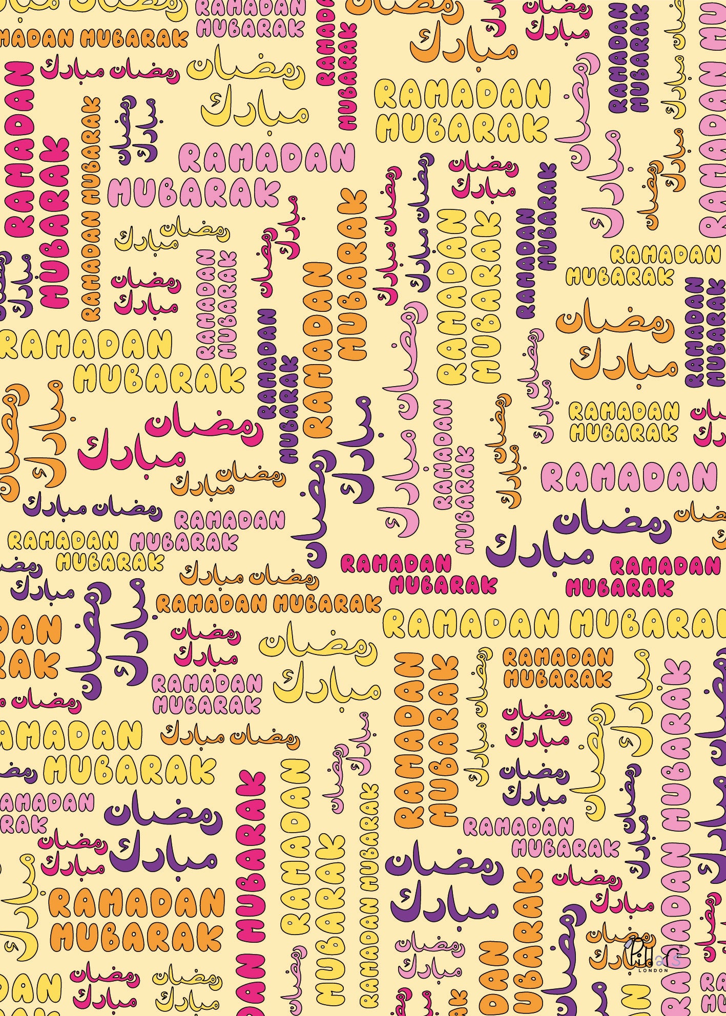 This wrapping paper features “Ramadan Mubarak” in both English and Arabic, created especially for children. The use of both languages supports early familiarity with Islamic greetings while keeping the design warm and approachable.