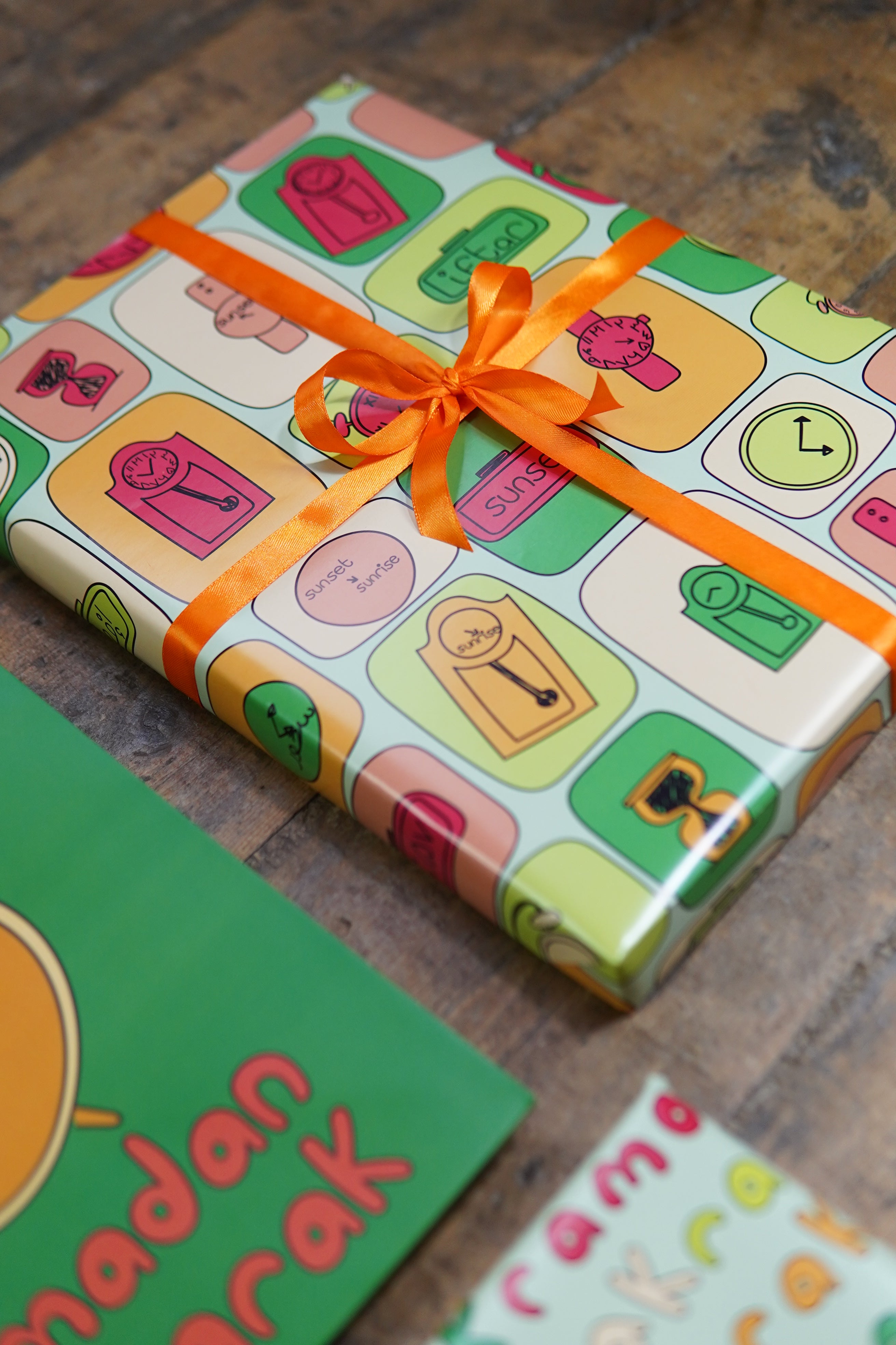 This children’s wrapping paper uses clock motifs to playfully illustrate the daily timings of iftar and suhoor. The design helps children visualise the structure of Ramadan days, making the routines of fasting clearer and easier to understand.