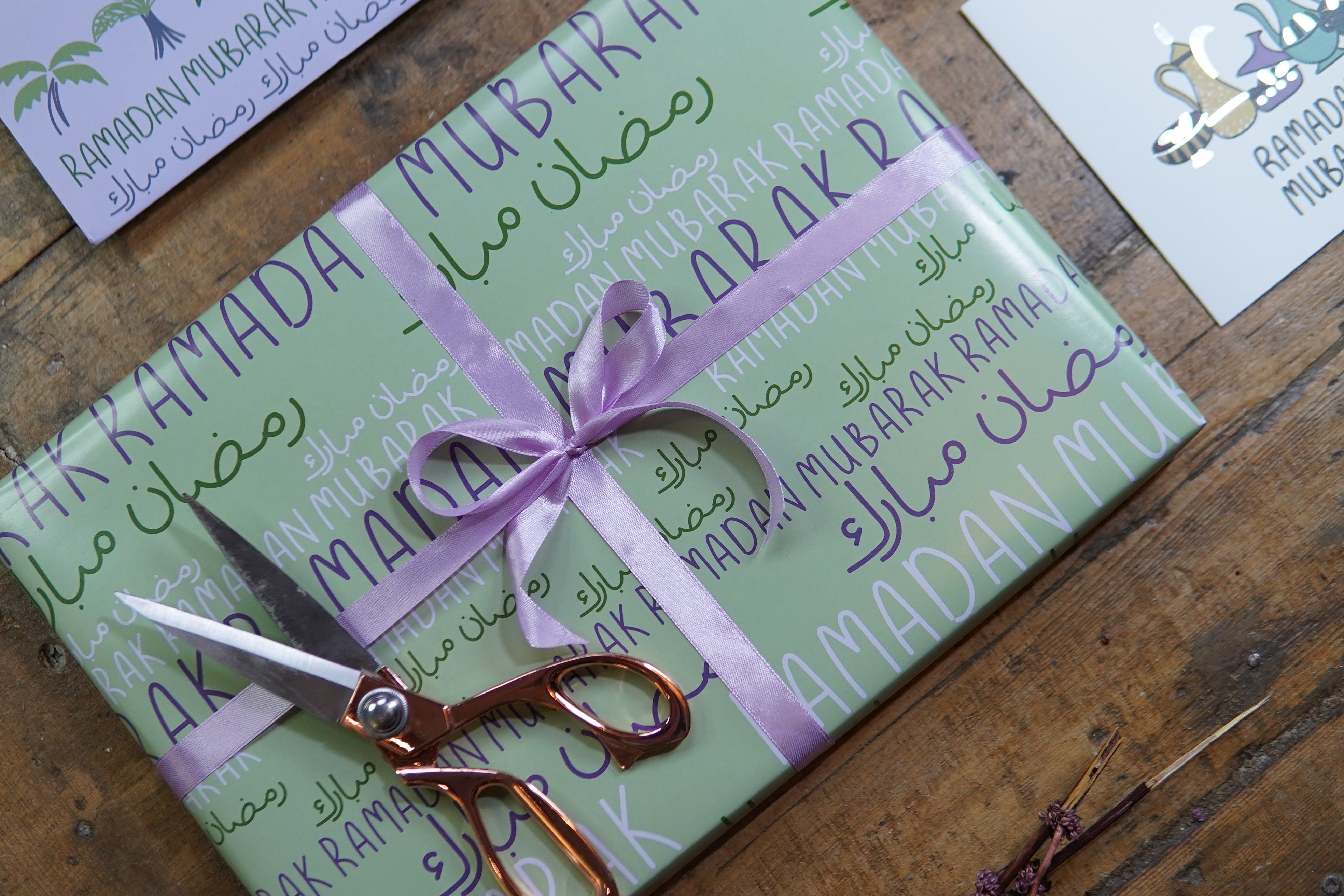 This wrapping paper features the greeting “Ramadan Mubarak” in both English and Arabic, creating a design that feels balanced and intentional. The typography allows the message to take centre stage.