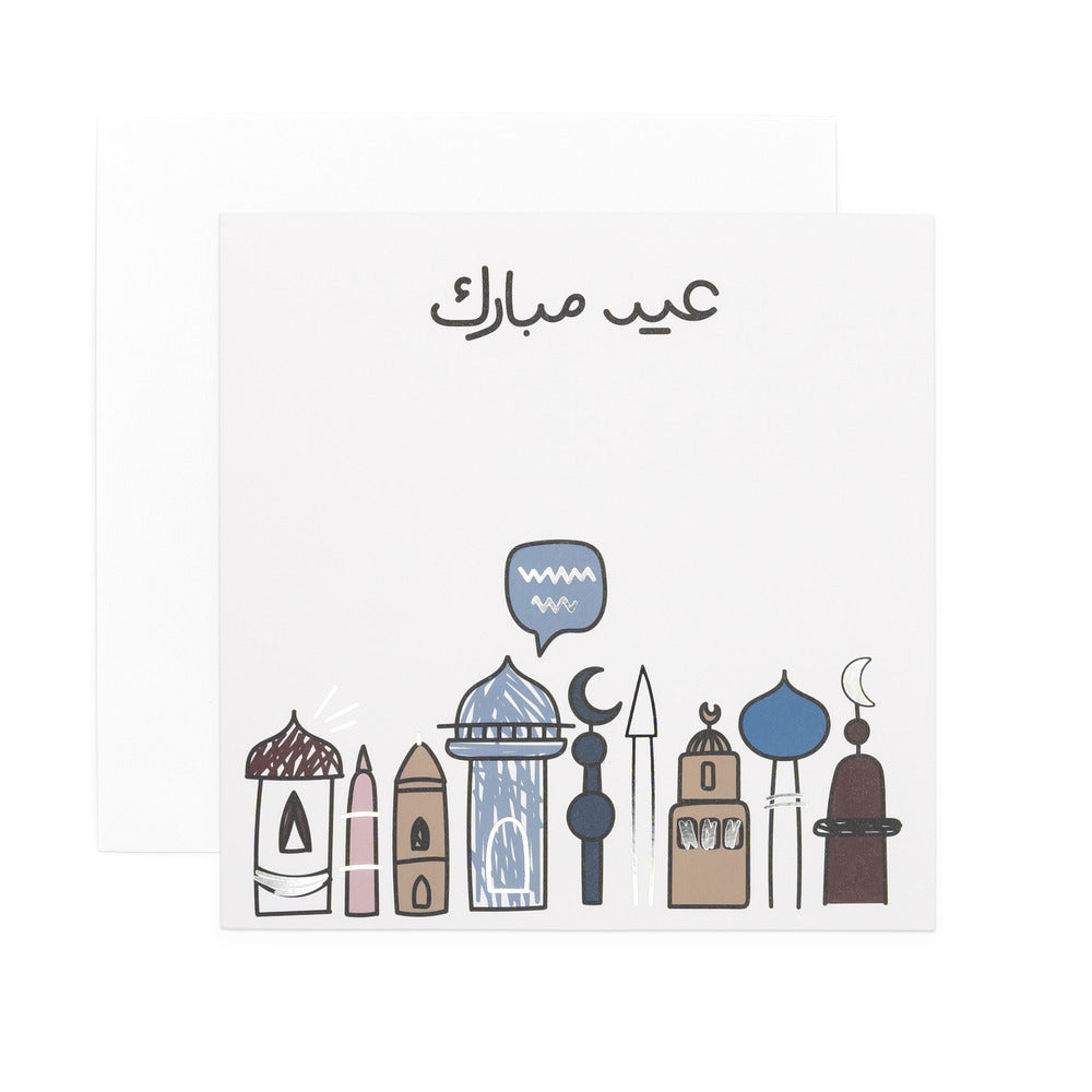 Drawing on the timeless beauty of Islamic architecture, this Eid greeting card showcases graceful mosque minarets as a symbol of faith, reflection and community. Finished with refined silver foil detailing, it offers a contemporary yet reverent way to share warm Eid wishes.